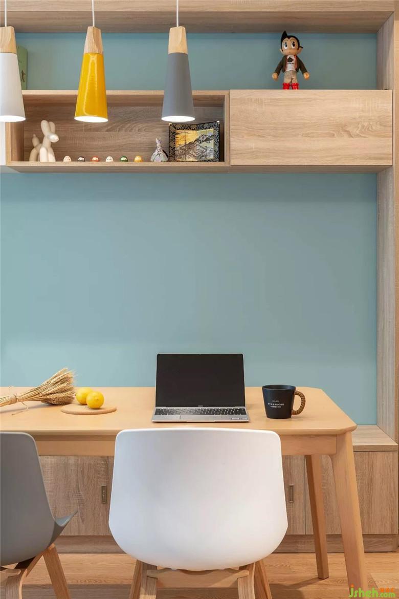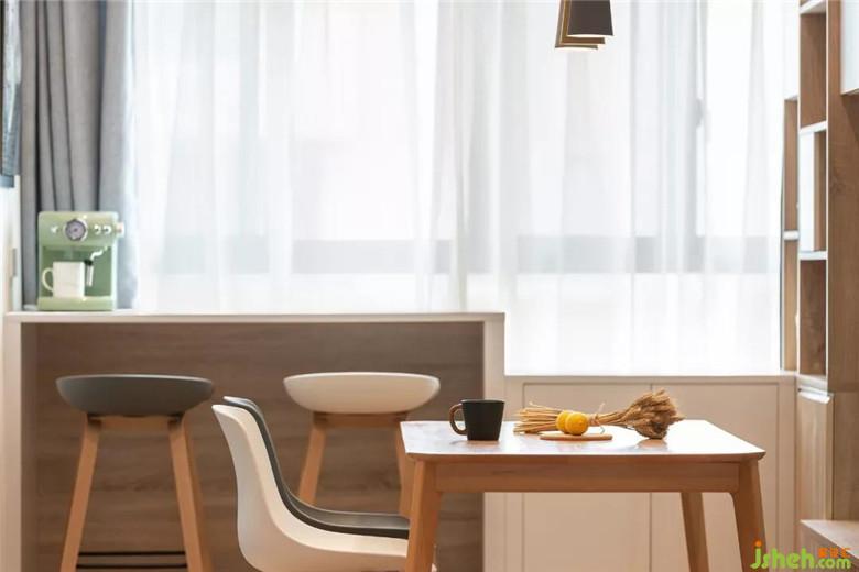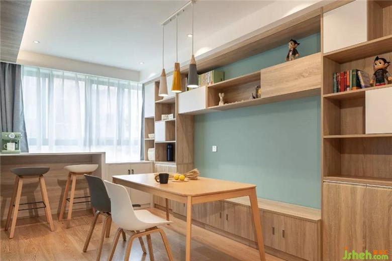 業(yè)主喜歡看書,設(shè)計師知道后將原本的餐廳重新設(shè)計,原木色的書柜加上白色的吧臺,讓餐廳不僅僅只是餐廳還兼具了看書和辦公的功能,豐富了功能性的同時,增加了小資情調(diào)。