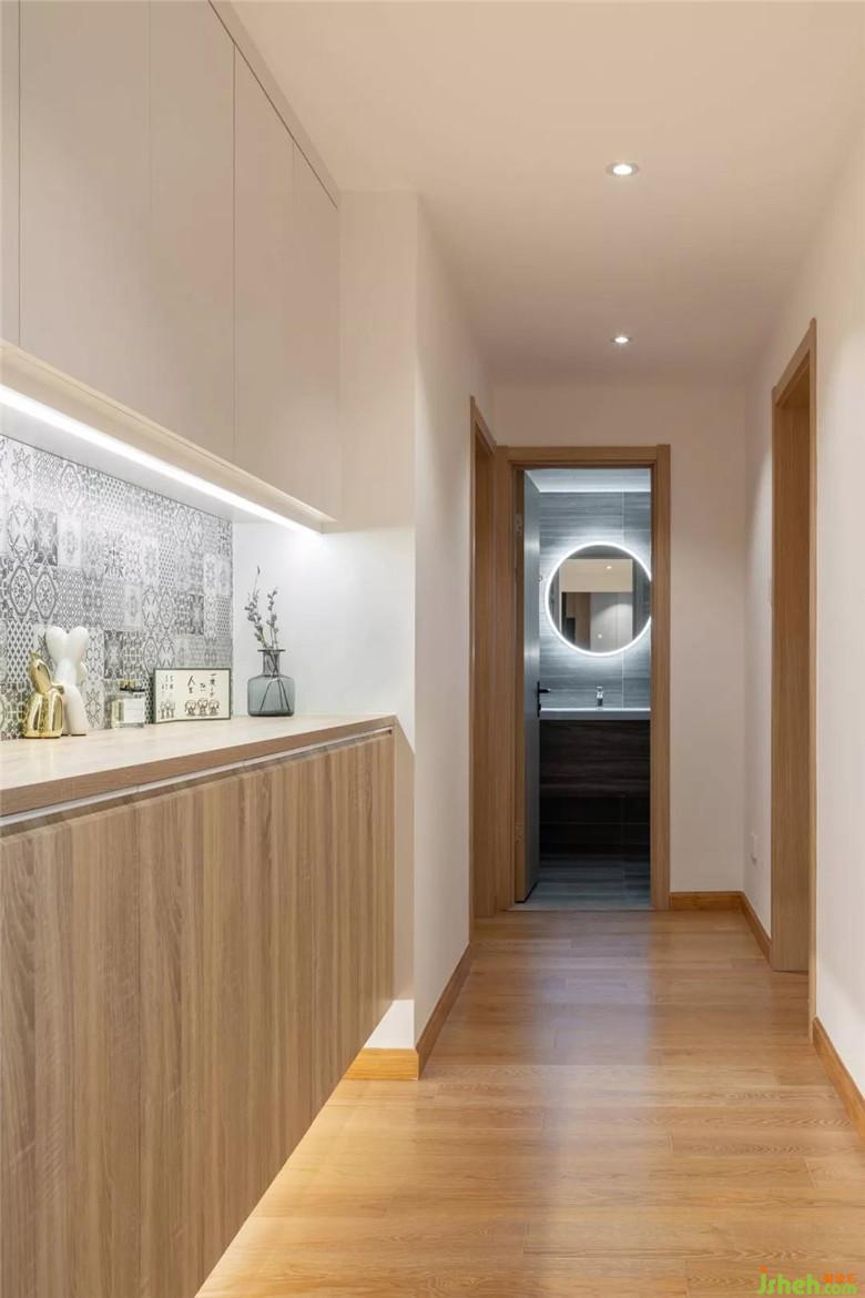 過道邊柜的設(shè)計加上黑白花磚增加了空間感的同時,保證了儲物空間。
