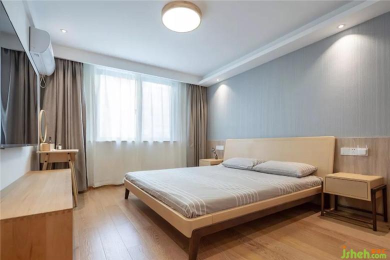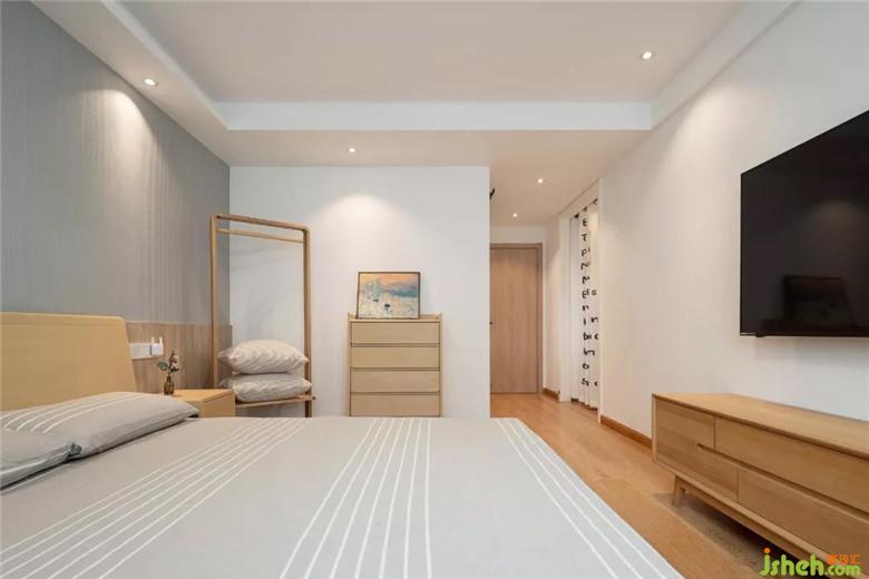 臥室同樣使用了大面積的原木色,搭配灰色床品和藝術(shù)涂料,簡(jiǎn)單卻不失溫馨。