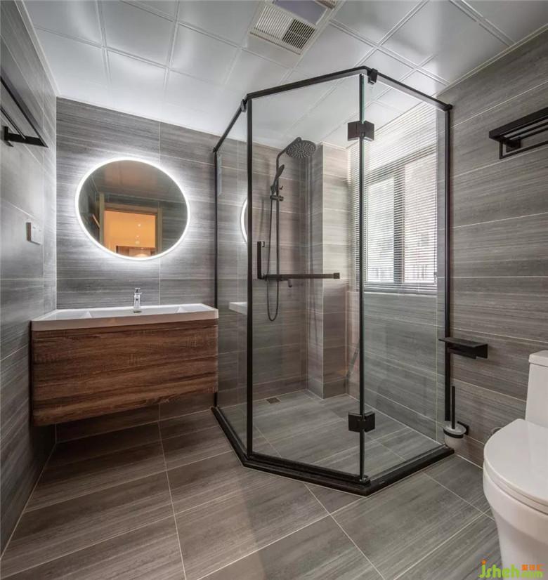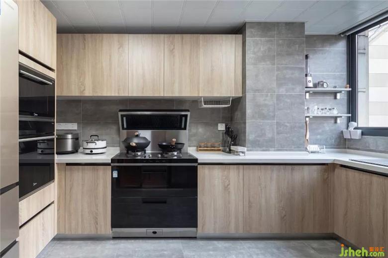 廚房設(shè)計(jì)上灰色瓷磚和原木色櫥柜搭配相得益彰,冷暖色碰撞顯得廚房時(shí)尚高端。