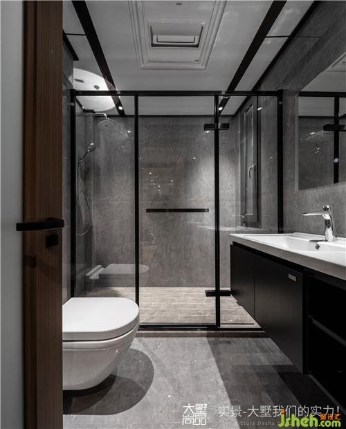 淋浴區(qū)以玻璃作為隔斷,黑色線條勾勒