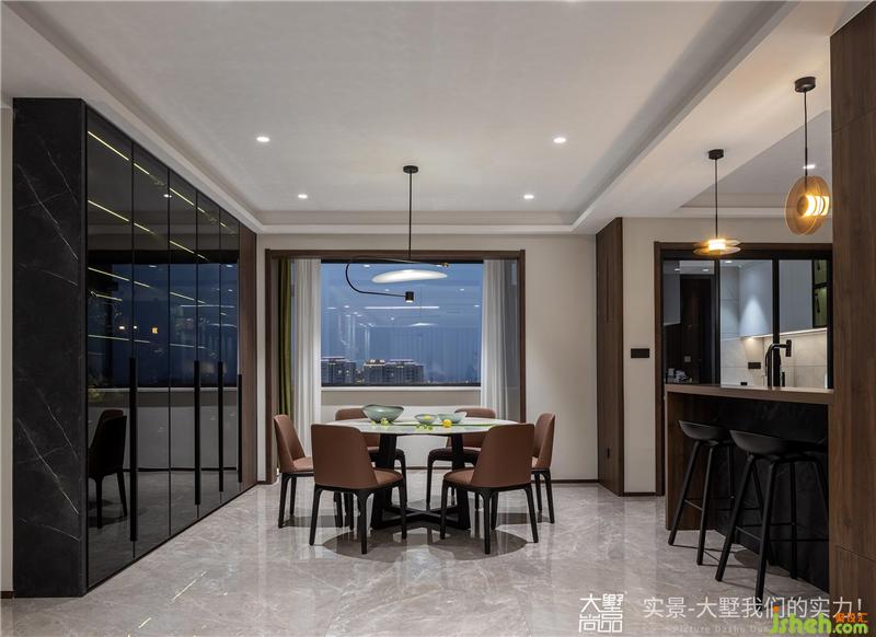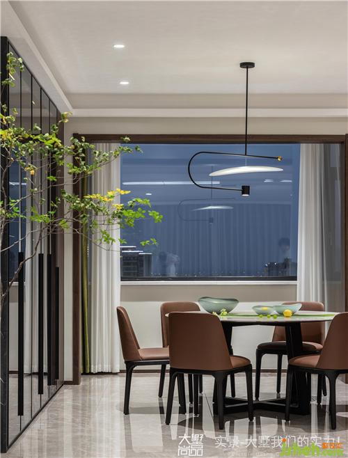 棕色皮質(zhì)餐椅、不規(guī)則吊燈及柔和的燈光,打造出了一個(gè)優(yōu)雅情趣、充滿儀式感的用餐環(huán)境。
