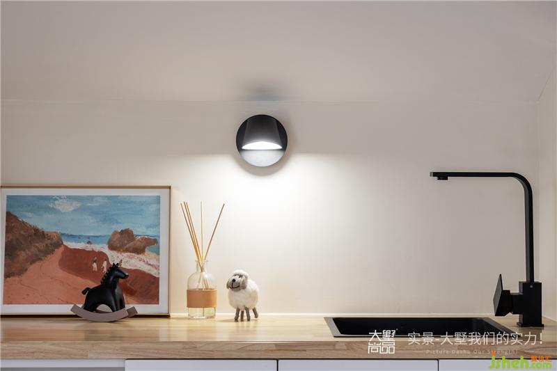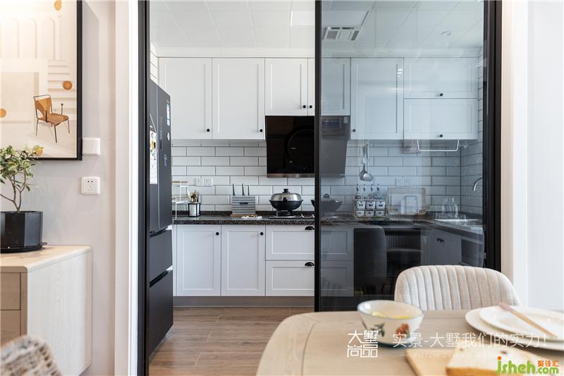 墻面鋪陳小長磚,黑色亞光面美縫襯托磚面更加的亮澤,櫥柜選用白色門板,讓靠北面的廚房顯得更加明亮,黑色的操作臺更方便清潔。