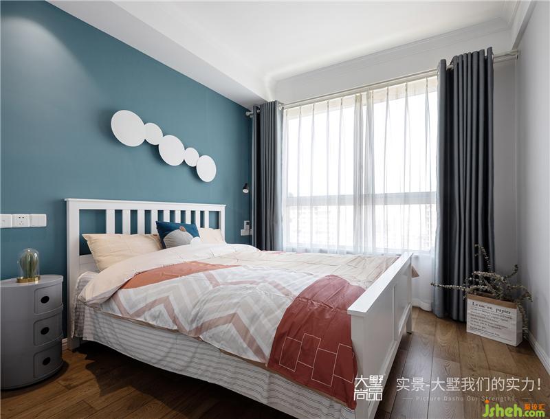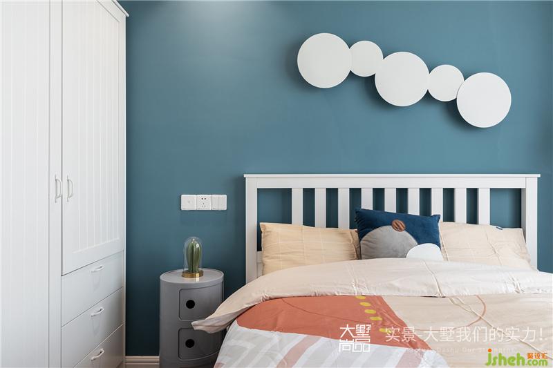 藍(lán)色背景墻在大面積白色中已然占據(jù)最醒目的焦點位置,圓形裝飾品讓空間看起來更加具有活潑特點常州室內(nèi)設(shè)計師。