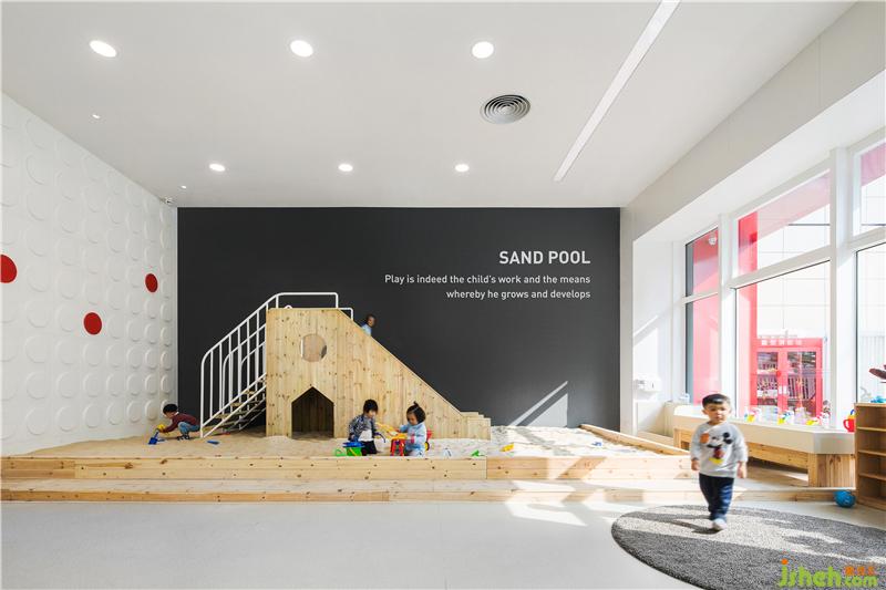 前廳是是每個(gè)孩子每天在進(jìn)入這幢建筑之后的必經(jīng)之路,我們希望除了接待功能之外,前廳也是一個(gè)有趣的、有活力的的空間,因此沙池被安排到該區(qū)域靠窗的位置,讓孩子可以陽(yáng)光中活動(dòng)。裝修公司