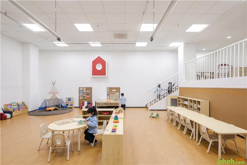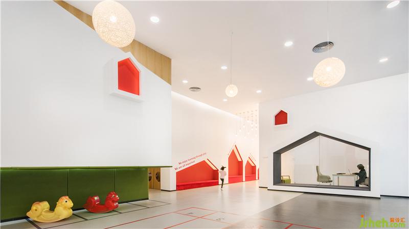 玻璃幕墻一側被規(guī)劃為公共活動區(qū),日間的陽光充滿該區(qū)域,公共活動區(qū)內定制了結合滑梯,攀爬,搖蕩等功能的活動器械,有效的讓孩子在游戲中認識到空間,平衡,速度和節(jié)奏,同時也是對戶外活動場地面積的補充。裝修公司