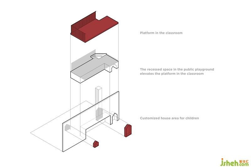 這樣的錯層也在教室中形成抬高的平臺,豐富了教室的空間層次的同時也增加了孩子運動量。教室內還設置了獨立的小房子,并將樓梯下方設計為可供兒童鉆爬的小空間,這些空間在實際使用中深受喜愛,成了孩子們私下交換秘密和角色扮演的地方。