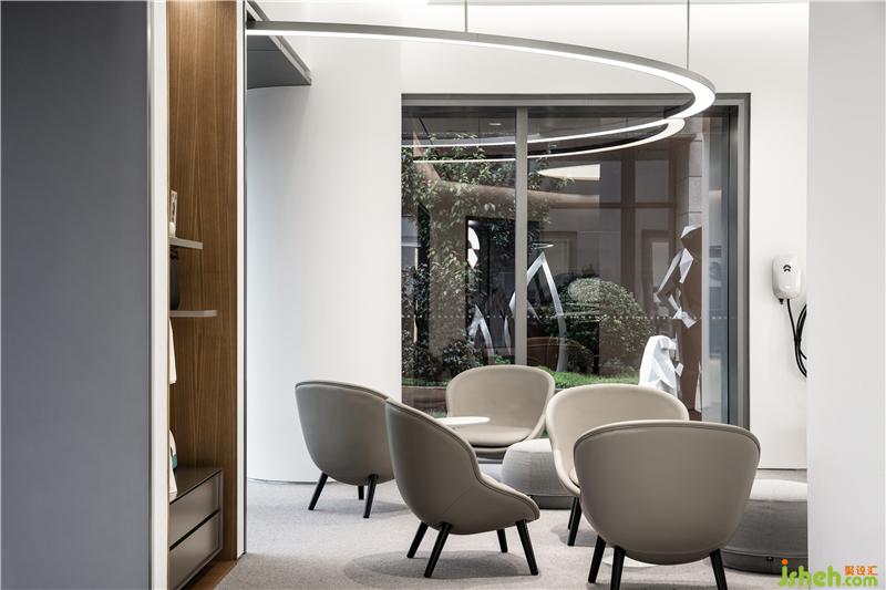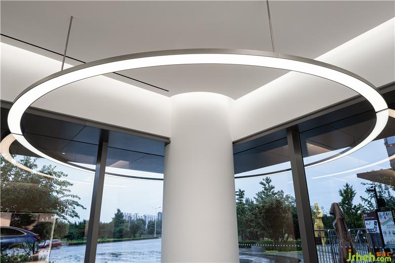 ▼貫通室內(nèi)外的圓環(huán)燈自然的將顧客的目光引向室外,戶外鋪設(shè)的木地板和草坪為整個空間引入自然舒適的氣息,消解了傳統(tǒng)汽車銷售展廳冰冷的氣質(zhì)
