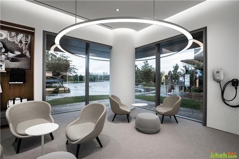 利用空間中兩個承重柱之間的范圍鋪敘休閑洽談區(qū),巧妙地營造了或隱或現(xiàn)的交流場景。洽談區(qū)位于轉(zhuǎn)角櫥窗處,NIO LIFE 展示區(qū)則被規(guī)劃在靠近櫥窗一側(cè),該區(qū)域通過貫通室內(nèi)外的圓環(huán)燈自然的將顧客的目光引向室外,戶外鋪設(shè)的木地板和草坪為整個空間引入自然舒適的氣息,消解了傳統(tǒng)汽車銷售展廳冰冷的氣質(zhì),為用戶提供一個溫暖而閑適的休閑場景。
