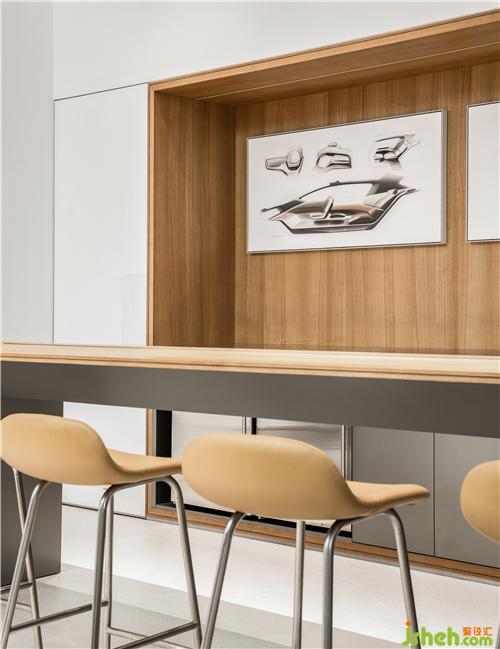 基于用戶體驗布局多功能用戶專區(qū),試圖成為品牌用戶除了工作、生活之外的第三空間,4S店裝修設(shè)計為用戶提供咖啡品鑒、休閑社交、品牌活動等多樣化的生活休閑場景。親和力的木色與柔和的光線構(gòu)造舒適、自然的氣息,品牌產(chǎn)品細(xì)節(jié)的手繪圖則賦予空間藝術(shù)風(fēng)格的同時低調(diào)的傳達出品牌的工匠精神。