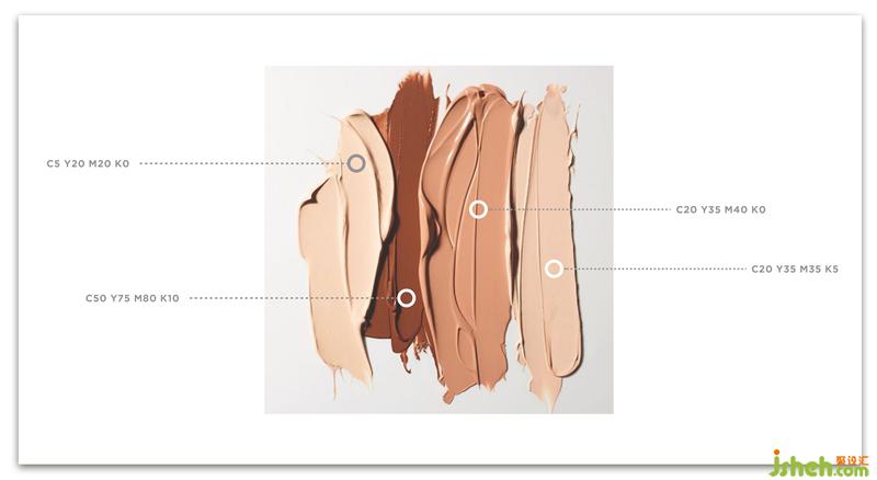 品牌視覺部分,MOC以更加簡化的字形為基礎構成其標志,予人中性優(yōu)雅的視覺印象。色彩上,則從不同膚色女性粉底液的色彩中,提煉出色彩系統(tǒng)方案,奠定了包容、優(yōu)雅的精神氣質(zhì)。