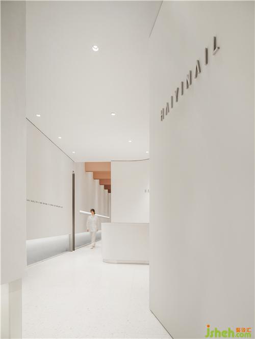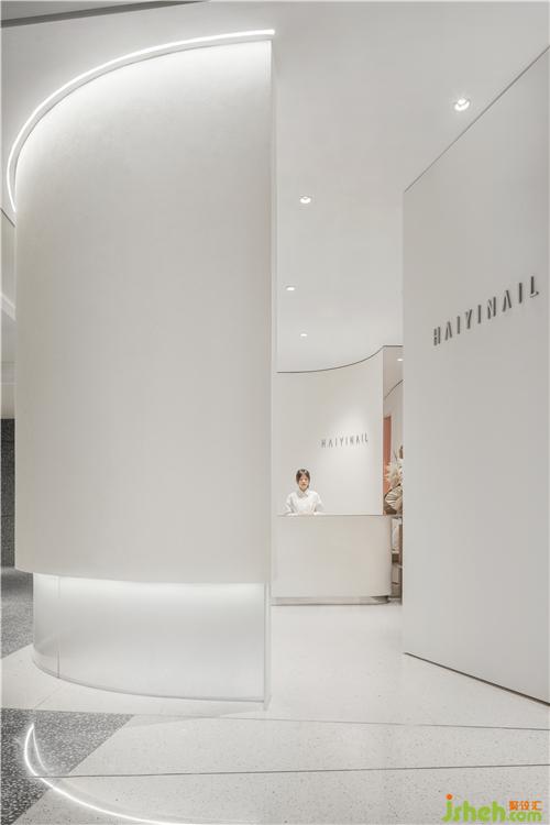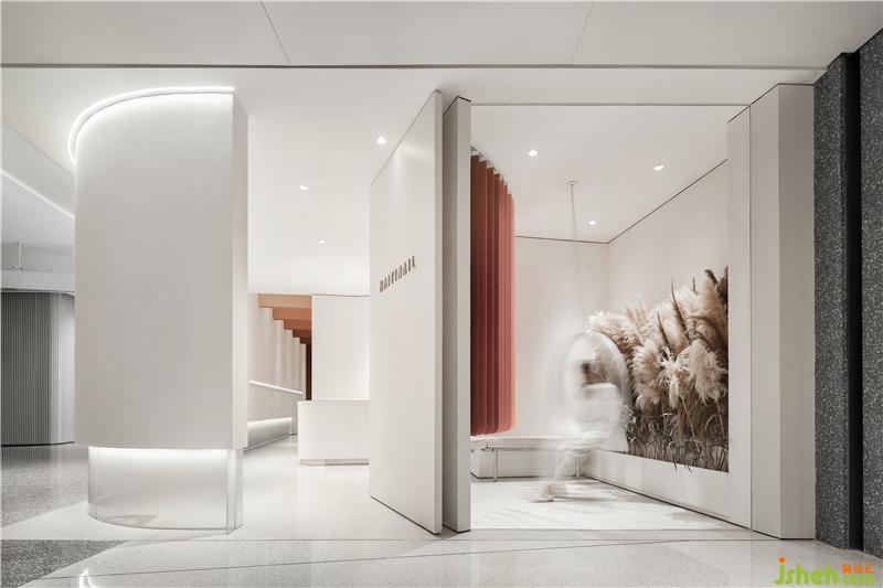 空間設計中抽象化運用羽毛的輕盈與回旋形態(tài),深圳美甲裝修設計并將不同膚色女性粉底液的色彩系統(tǒng)提煉為低飽和度的用色方案,共同構建包裹性的舒適空間感受。