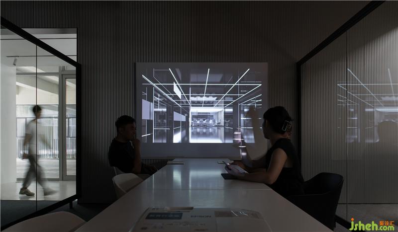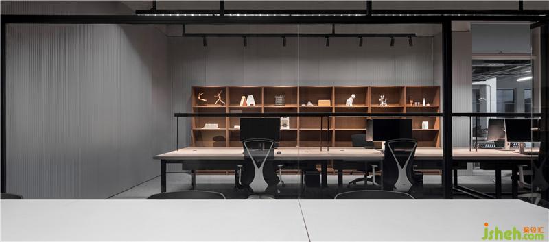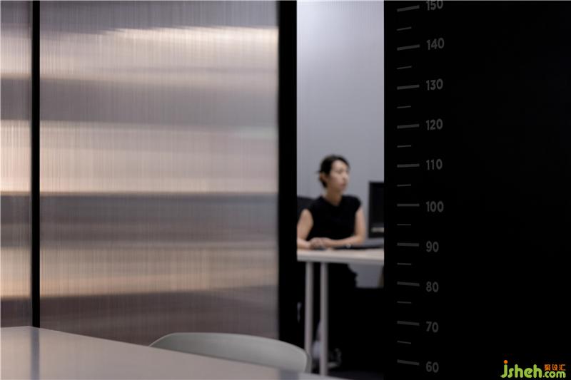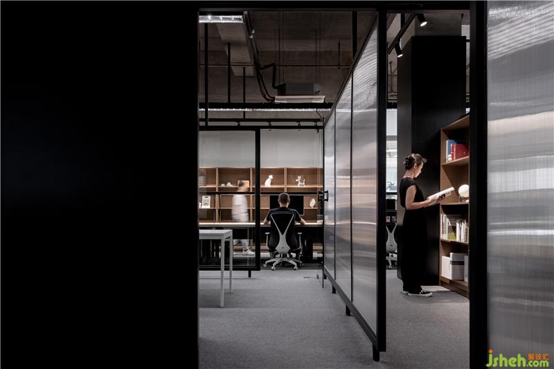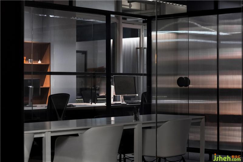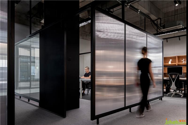 考慮工作性質(zhì)帶來的人群聚散,置于空間中的盒子區(qū)規(guī)劃為會議室和總監(jiān)辦公室,盒子的兩側(cè)的公共辦公區(qū)則分布了設(shè)計(jì)辦公區(qū)和其他輔助部門辦公區(qū),動線圍繞兩個(gè)盒子展開。會議室以通透的玻璃隔斷圍合,而辦公室盒子則以雙層陽光板及玻璃圍合,滿足辦公室一定程度的私密需求。