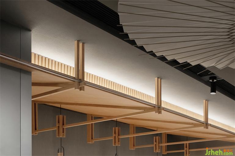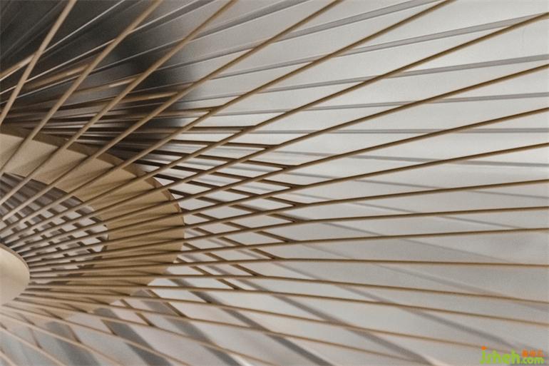 傘的元素不止體現(xiàn)在動(dòng)態(tài)裝置上,在解構(gòu)了雨傘后,傘架結(jié)構(gòu)也延展至空間內(nèi)部的屋檐結(jié)構(gòu)和道具細(xì)節(jié)上。