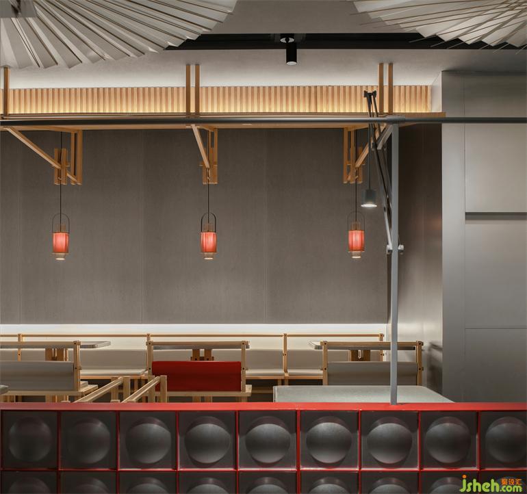 On the other side of the space, the eaves are placed opposite to each other. Between them, five large umbrella installations are mounted on the ceiling and turning slowly in different directions, which makes an interesting visual experience in the restaurant.