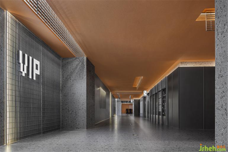 大廳的橙色天花體塊向通道延伸