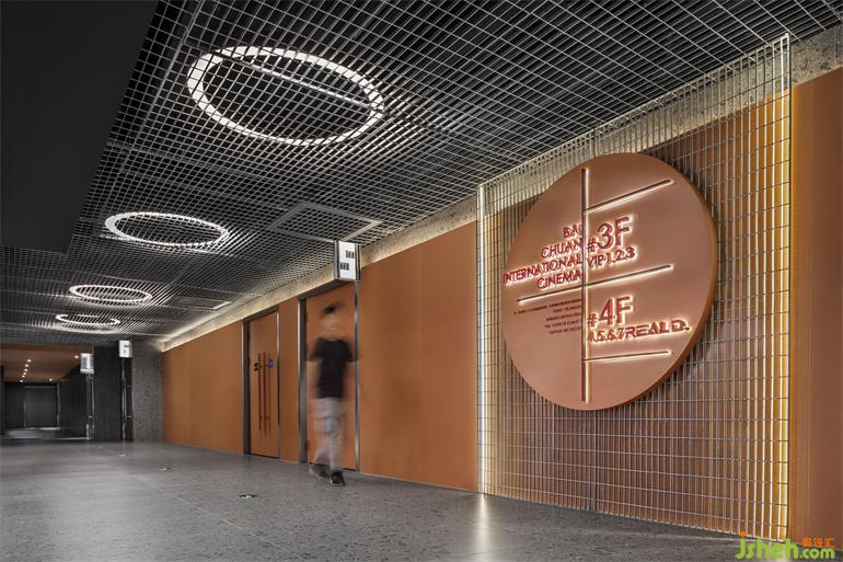 The cinema spans twofloors, with no lobby on the upperfloor. MOC follows the design elements, using bright orange on thewalls, while the ceiling retains the ring lights and grilles of the lobby, giving the whole space a unified tone with variation.
