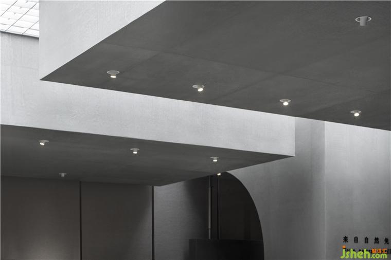 結合空間結構和功能需求,MOC在空間中以清水混凝土體塊對空間進行劃分,而結構體塊上方則以框架型燈膜覆蓋,框架柔和了燈光,光線在體塊之間滲透下來,勾勒出禪意。