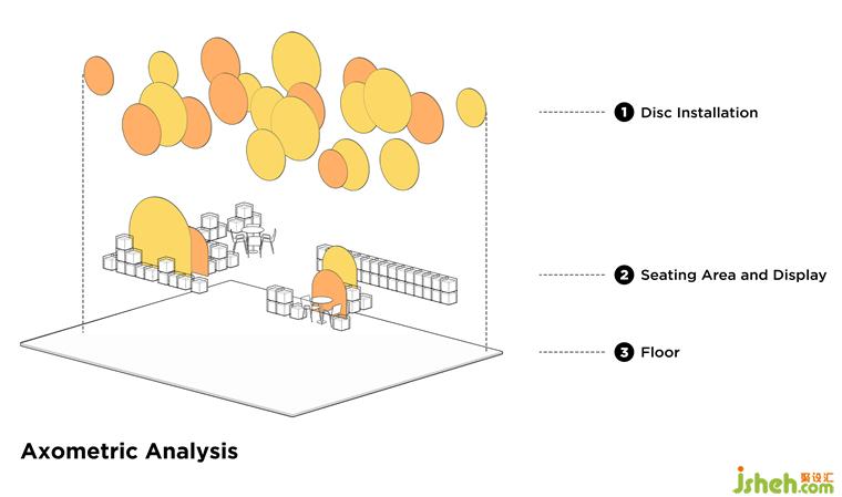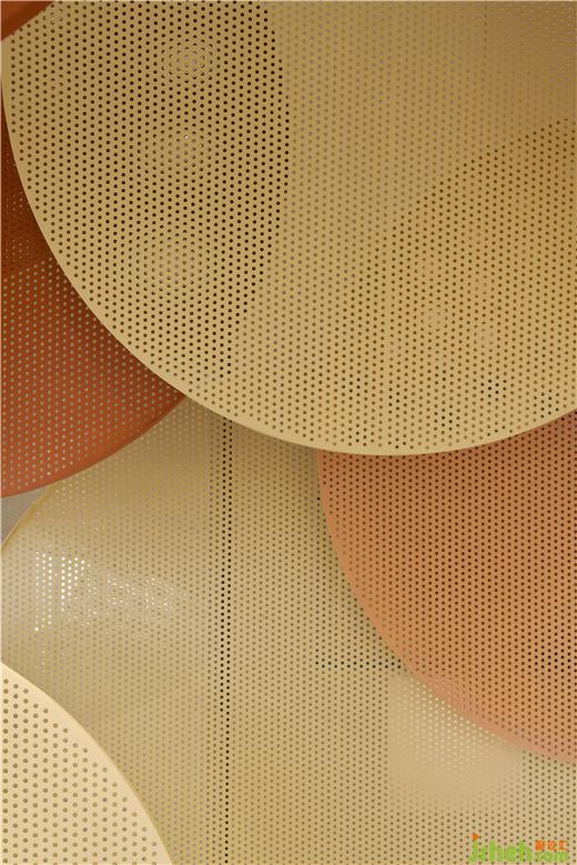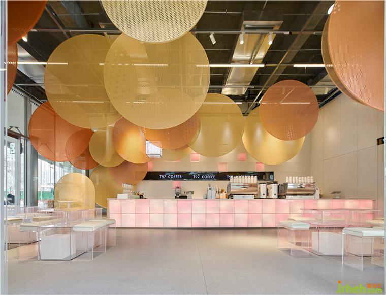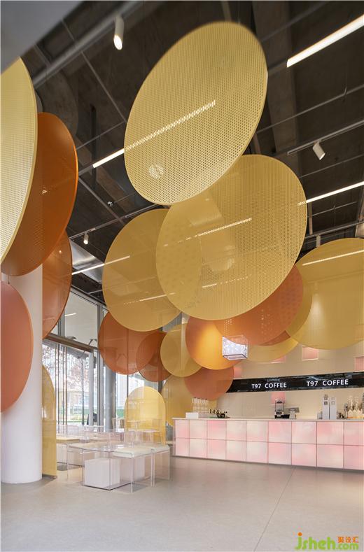 咖啡店設(shè)計空間內(nèi)部保留了裸露的混凝土天花,在其中搭建框架,框架上方用懸掛固定不同大小的定制沖孔板,不同大小的橙色系沖孔板構(gòu)筑出的色彩層次,抽象化的回應(yīng)秋日印象,與戶外的逐步變黃的綠植景觀互相呼應(yīng)。