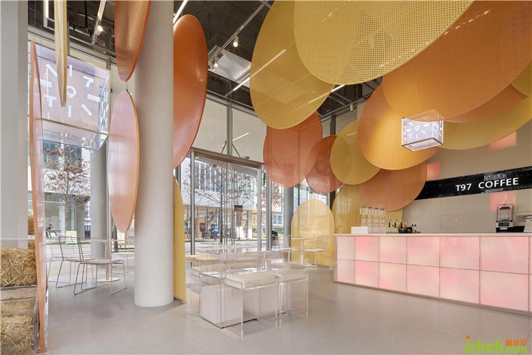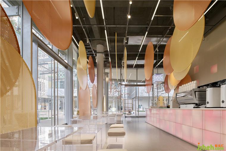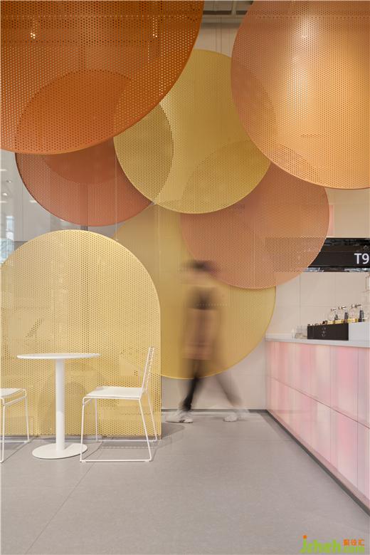 吧臺(tái)內(nèi)置可變色燈板,咖啡店設(shè)計(jì)除了匹配秋季色彩主題,更考慮后續(xù)可根據(jù)不同季節(jié)場(chǎng)景調(diào)整匹配的顏色。