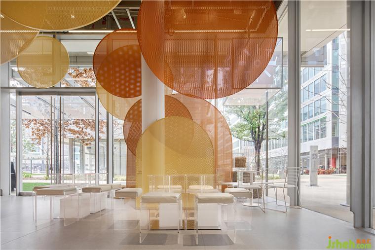 The hanging installation is the visual focal point of the site. MOC has weakened the presence of furniture and customized the coffee tables and displays with transparent acrylic. Different elements can be fit into the acrylic to create different effects. For this specific autumn theme,straw bales are the seasonal feature.