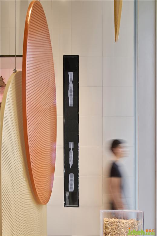 咖啡店設(shè)計(jì)以空間懸掛的裝置作為場(chǎng)景視覺(jué)焦點(diǎn),我們?nèi)趸思揖叩拇嬖诟?,為該?xiàng)目定制了透明亞克力的茶幾和展臺(tái),透明亞克力內(nèi)部可填充對(duì)應(yīng)季節(jié)的內(nèi)容物。在本場(chǎng)秋季主題中填充草垛回應(yīng)季節(jié)特點(diǎn)。