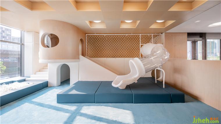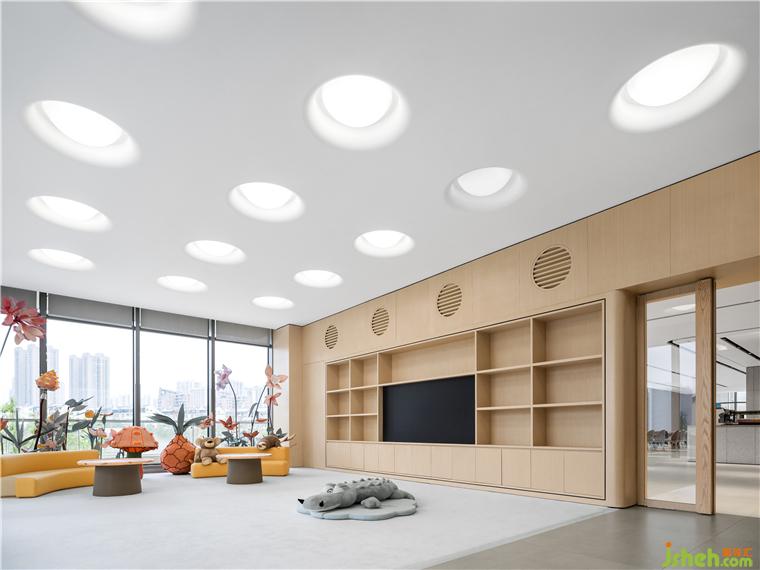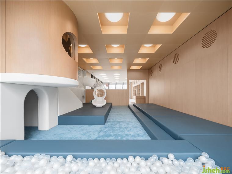The two areas meet the activity and entertainment needs of children at different ages. Meanwhile, spotlights are avoided in this area. Instead, only spherical lights are used to provide sufficient and soft lighting from the top.