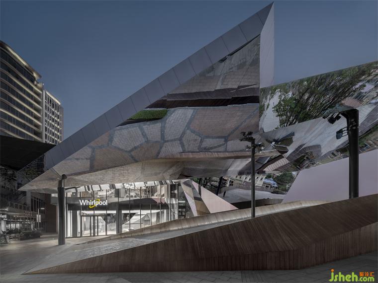 體驗中心設(shè)計從室內(nèi)向外生長的棱鏡造型,與建筑外部的雕塑達成銜接
