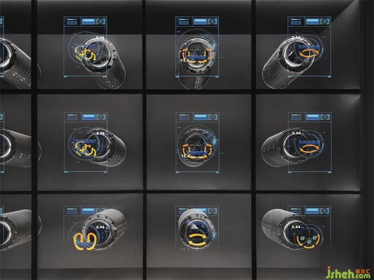 展廳的另一側(cè)規(guī)劃為洗衣產(chǎn)品技術(shù)展示區(qū)。體驗(yàn)中心設(shè)計(jì)師將產(chǎn)品進(jìn)行解構(gòu)展示,墻面的互動裝置游戲讓參觀者輕松的了解枯燥的技術(shù)細(xì)節(jié)。