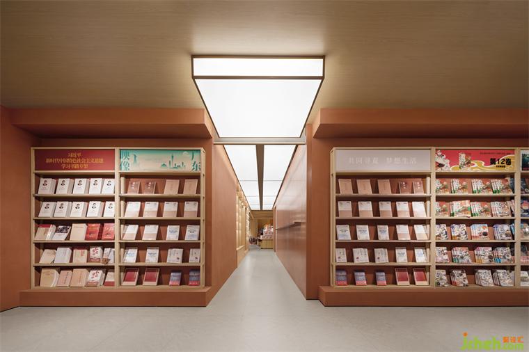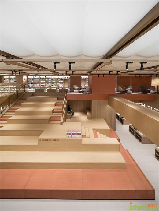 書店設(shè)計(jì)在階梯上至二層的位置,一個(gè)懸挑的“紅色盒子”被安置在此處,盒子里布置了幾個(gè)不同尺度的房間,面向劇場舞臺(tái)方向,作為劇場功能的補(bǔ)充;落地玻璃的展示面則提示人們在這里“交流討論”是被鼓勵(lì)的,另一方面則保證了這里與公共空間的聲音不會(huì)相互干擾。