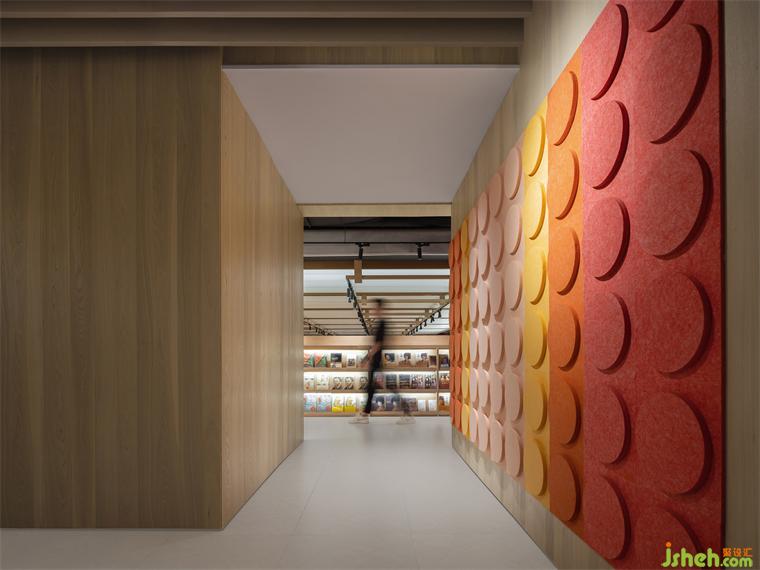 書(shū)店設(shè)計(jì)沿著喇叭盒子的樓梯進(jìn)入二層的繪本館,色彩也隨之在統(tǒng)一的色調(diào)下豐富起來(lái)。在色彩的變奏之下,書(shū)架放置著分齡的兒童繪本,穿插其中的開(kāi)放座位讓家長(zhǎng)與孩子在其中共渡美好的親子閱讀時(shí)光。