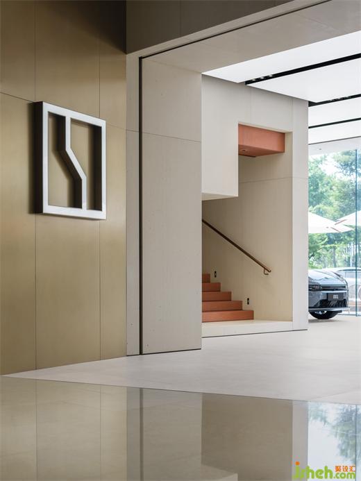 通透的玻璃幕墻引入自然光,米色的石材結(jié)合均勻的照明,為展車打造了溫暖明亮的環(huán)境。橙色的石材點(diǎn)綴其中增加空間活力。