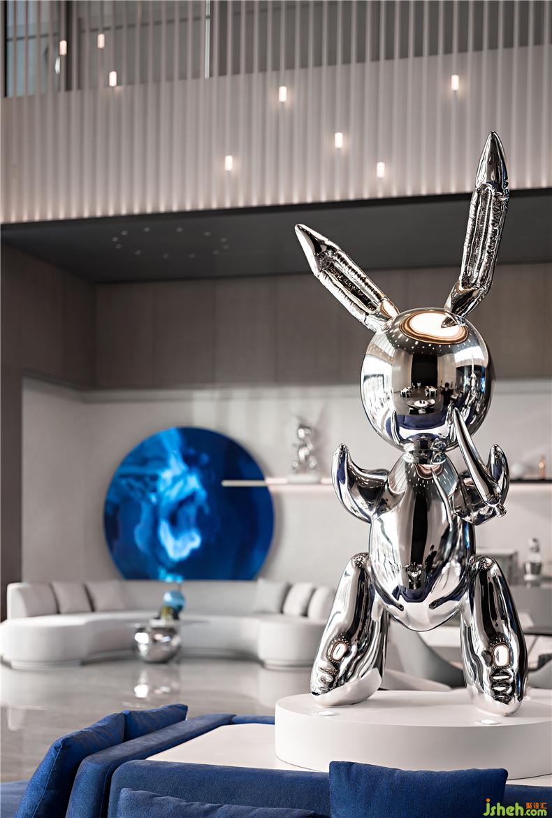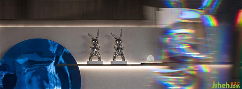 科技感的兔子公仔與墻面月亮裝飾交替呼應(yīng)在空間中,仿佛來(lái)自2046的機(jī)器人用另一個(gè)星球的語(yǔ)言再現(xiàn)童年時(shí)嫦娥奔月的傳說(shuō)。