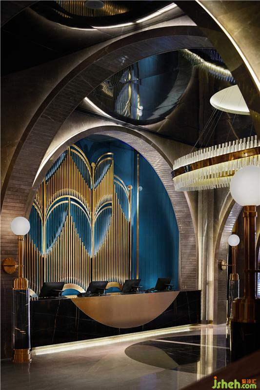 管弦樂(lè)器材質(zhì)運(yùn)用在整個(gè)大堂和走廊空間的裝飾中,連接大廳與走廊音樂(lè)殿堂空間主題,設(shè)計(jì)師在收銀臺(tái)后面風(fēng)管琴造型背景墻上,開(kāi)啟現(xiàn)代版“歡樂(lè)頌”樂(lè)曲的彈奏。