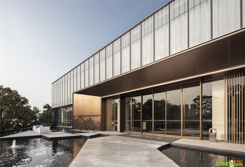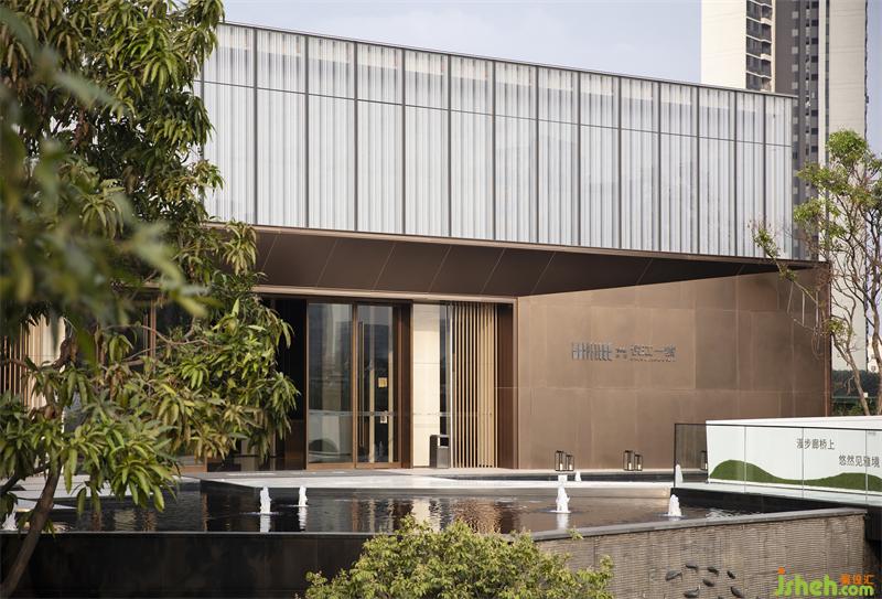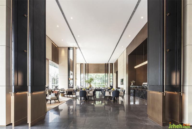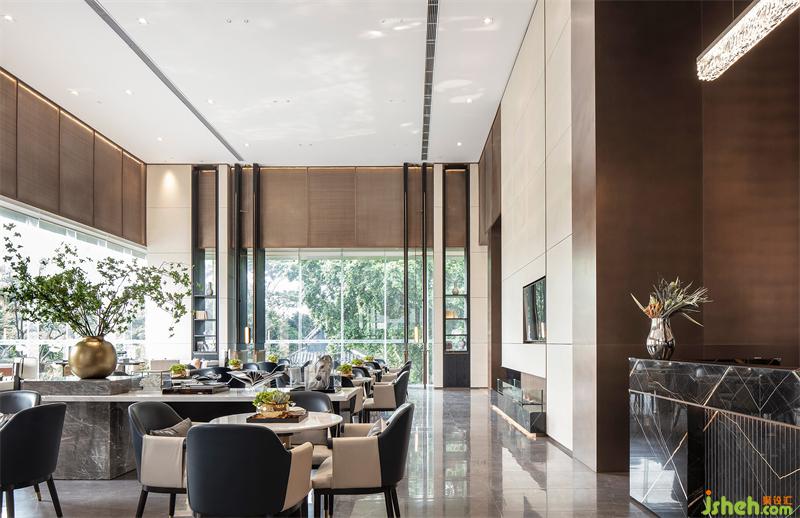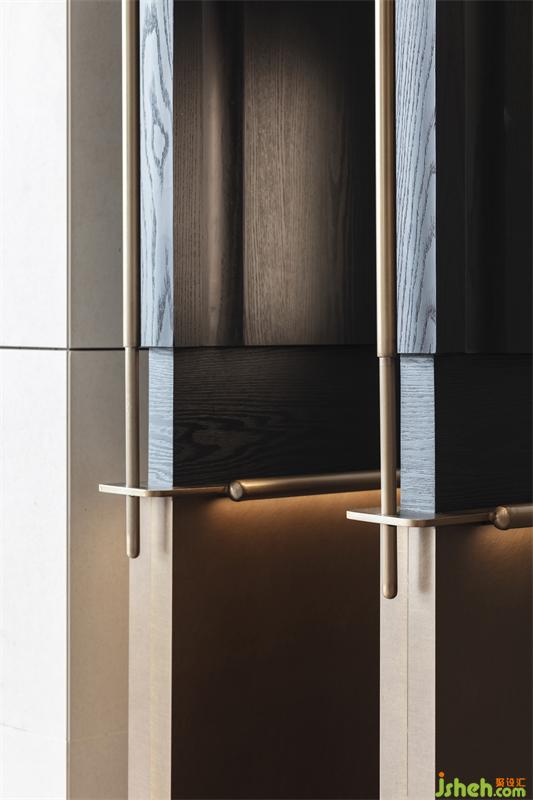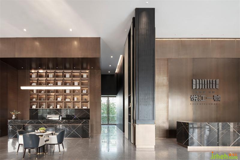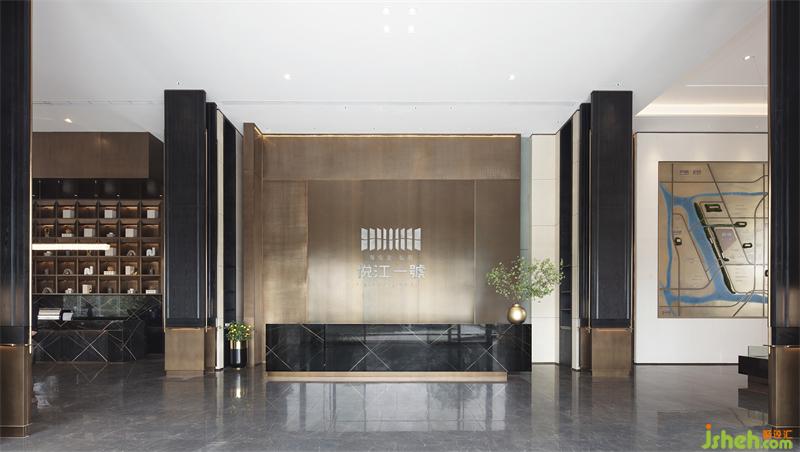考慮到項目本身的城市以及時代特色,延續(xù)建筑簡練明快的硬性構成,運用天然石材、不銹鋼、木飾面、沖孔板等現(xiàn)代而不失厚重的材質,打造兼具時尚感、力量感的硬朗設計主體,加入古銅金屬元素作為材質的文化植入,并將項目江水悅居寓意的logo圖形在空間中隱序延展,整體營造出一個擁有文化傳承而不失時尚、尊貴的現(xiàn)代都市主體空間。
