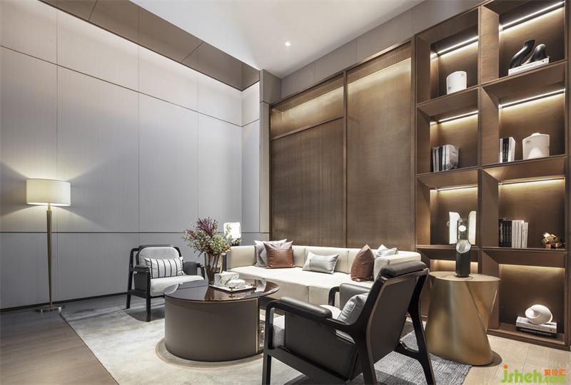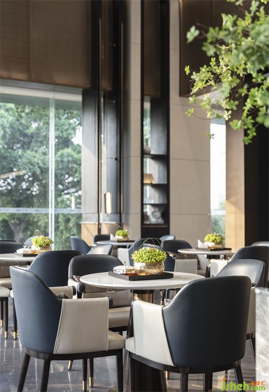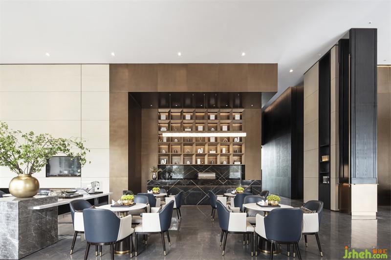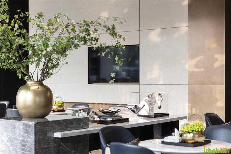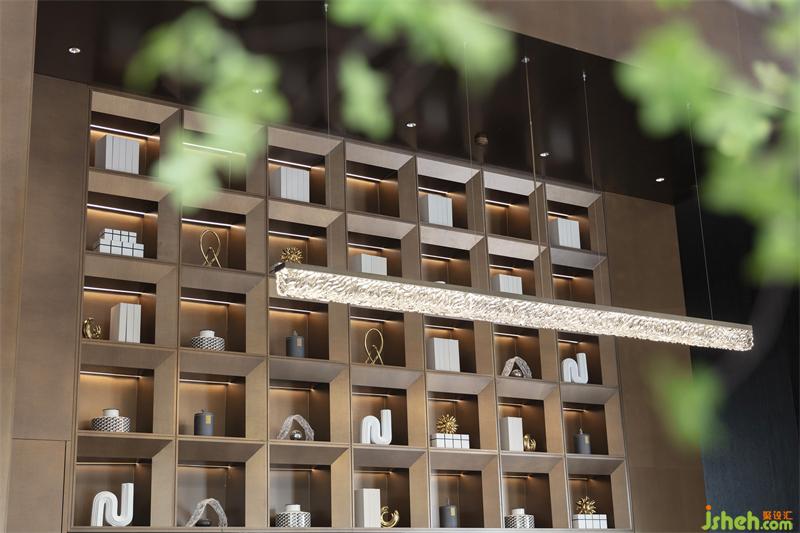 吧臺(tái)背后的陳列柜,兼具擺放與陳設(shè)功能,水波紋的燈飾與水晶擺件主次有序,即使是在看似不起眼的角落,也有江水潺潺的空間景象。