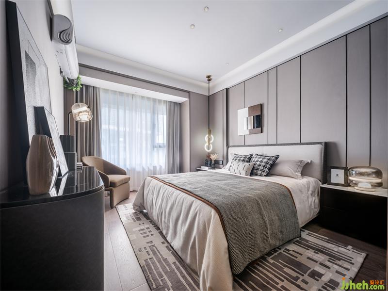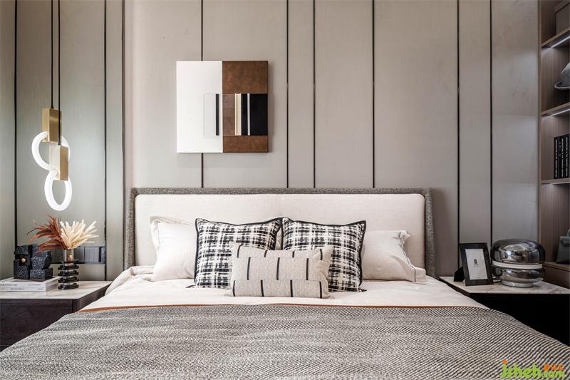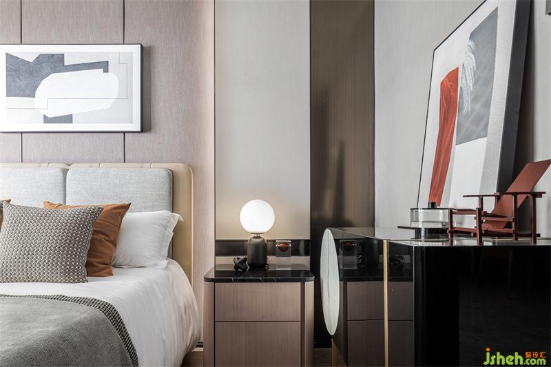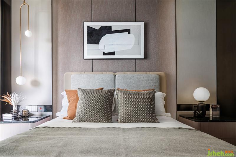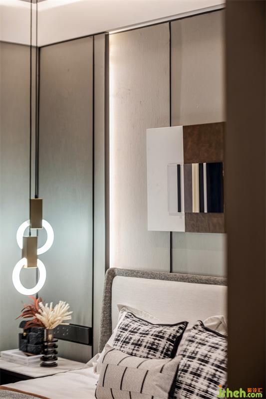 臥室整體的色調(diào)上是選用優(yōu)雅灰,兩個造型獨特燈飾的選用,是對簡潔空間的詮釋,縮減空間的物品裝飾,設計回歸純粹,通過材料的本質(zhì),賦予空間深度和溫度。
