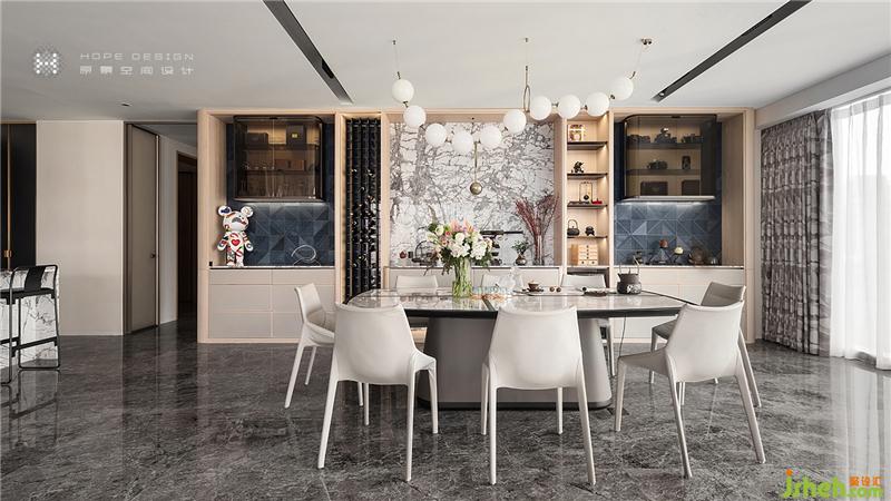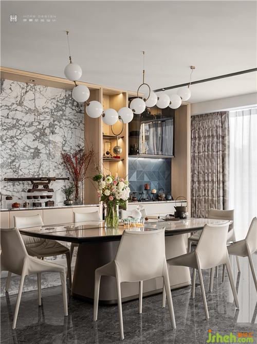 用餐區(qū)域精心挑選輕柔色,與珍珠項(xiàng)鏈般白色吊燈搭配呈現(xiàn)出和諧成熟的效果,混合著柔紗透過的日光浴讓整體更加溫馨明亮。