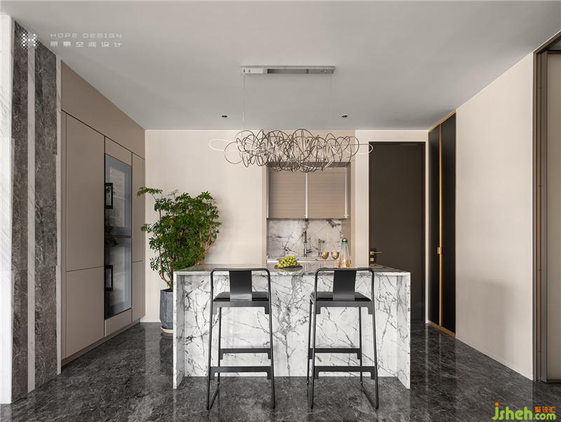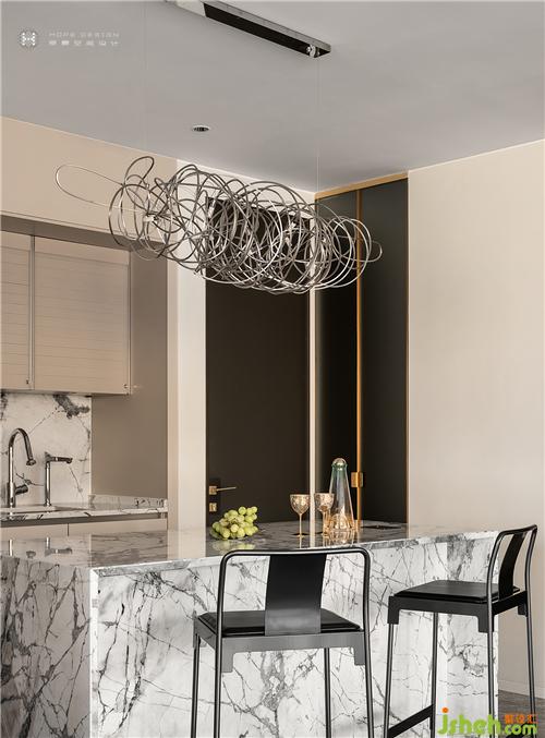 進(jìn)門以天然大理石中島規(guī)劃"回"形動(dòng)線,其自然多變的紋理給予空間強(qiáng)烈的張力。定制不規(guī)則排列的燈具,讓藝術(shù)氛圍擴(kuò)散的同時(shí),更與中島呼應(yīng)映射出不羈的生活態(tài)度。