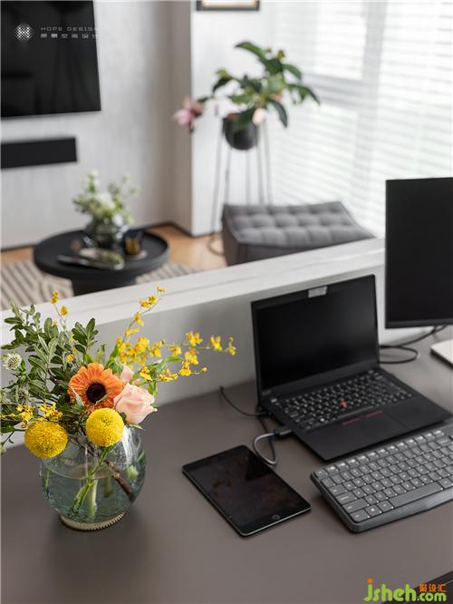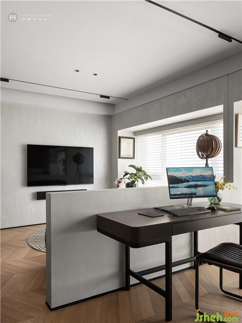 敞開開放式的寬綽空間,溫潤木地板把書房承托的更加典雅,目光隨著拼接脈絡悄然移動于書桌,好似才明白區(qū)域的更迭。