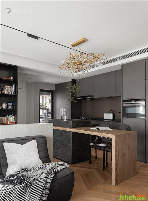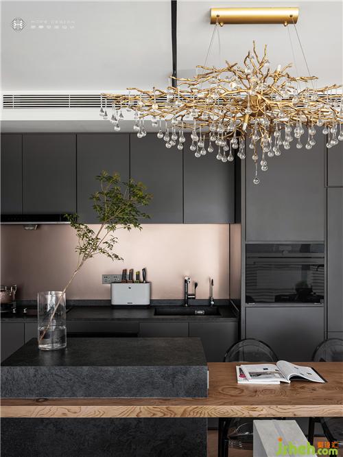 光滑烤漆櫥柜,大氣而不失格調。定制巖板石中島極好的視覺延展性,把餐廚整合在一起,創(chuàng)造溫馨溝通區(qū)域,而和餐桌連合產(chǎn)生的高低差,舒適又隨性。再將樹枝水晶吊燈作為點綴,讓自然元素給予廚房樸實質感。