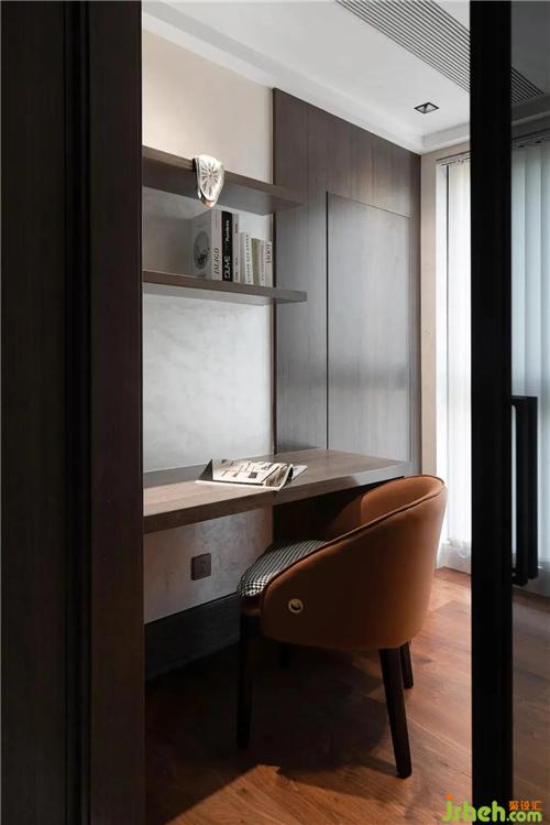 The study continues the style that the sitting room is consistent, hoar fastens to let whole space simple and agile, the chair for leaning on of deep orange lets a person shine at the moment. The opposite side of desk found a place for the bookcase of frontal wall, achieve maximal receive a function. Louvres and flowing clock pendant create a French atmosphere.