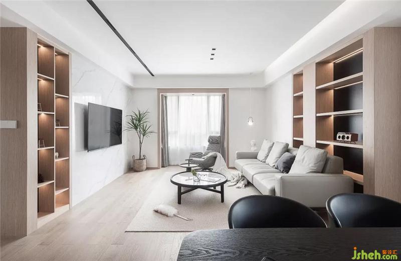 客廳吊頂無主燈。將需要照明的地方用黑色線條槽配以條形射燈,小吊燈、射燈代替,局部分散照明可以讓空間更有層次感。整個(gè)墻面空間都是大面積留白,局部搭配木飾面配以黑色,既溫暖又年輕時(shí)尚。