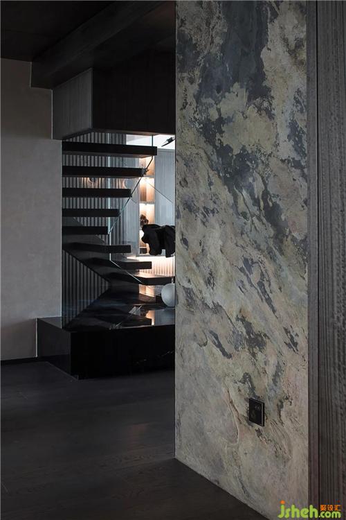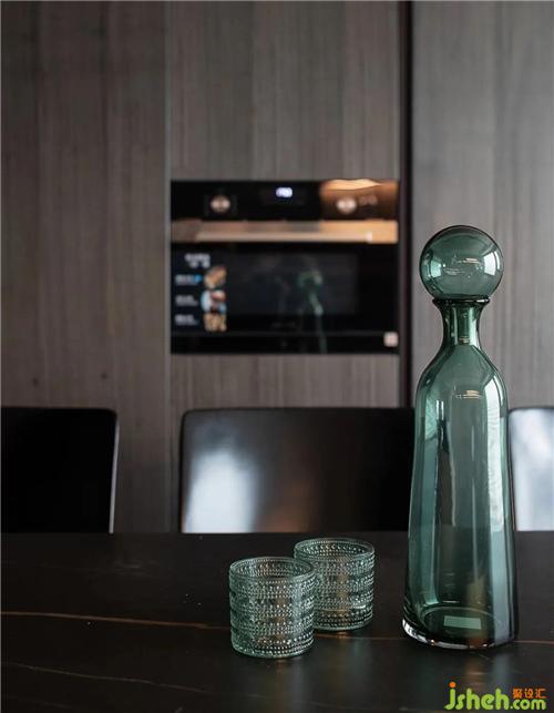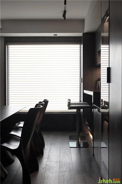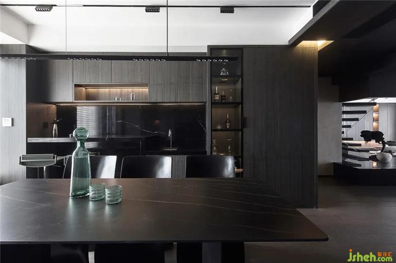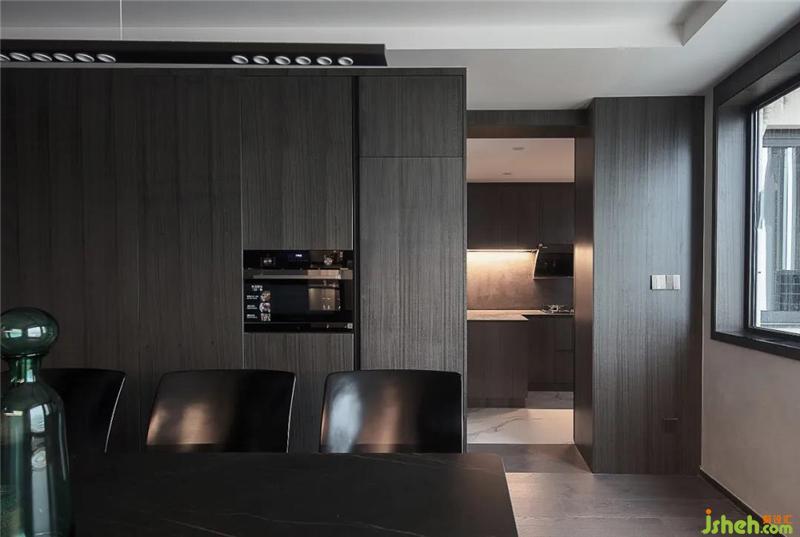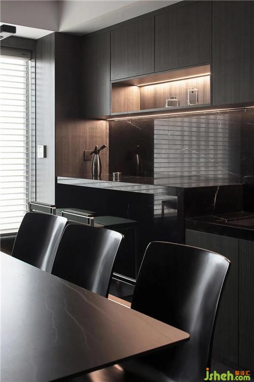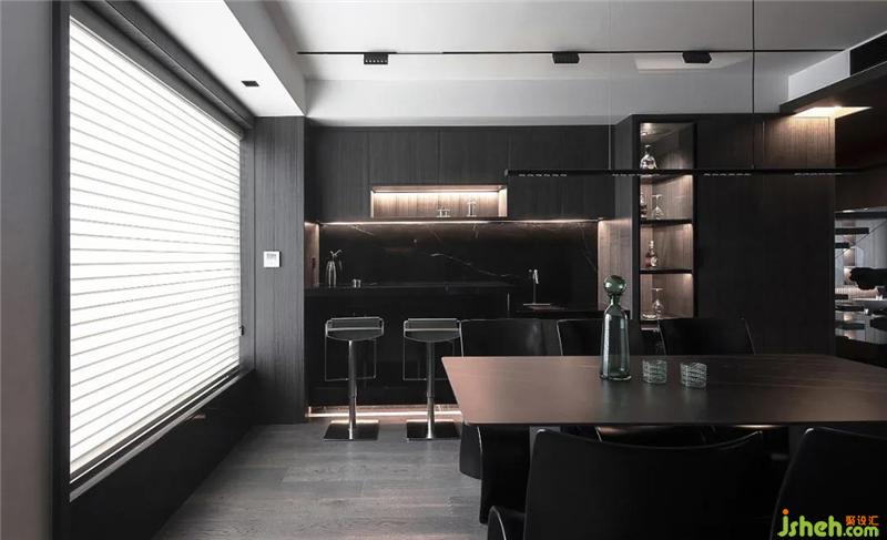 進門處的餐廳空間還是非常寬裕的,整體灰黑色調,采用了局部采光,空間層次豐富。黑色大理石打造的吧臺和木飾面,木與石碰撞極具質感,盡顯都市極簡時尚。