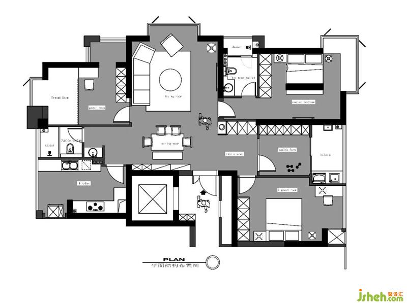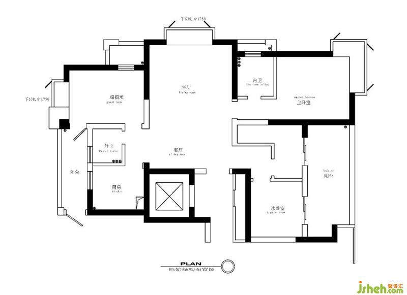 原有建筑存在幾大缺點(diǎn),北面廚房比較小 ,廚房外陽(yáng)臺(tái)沒(méi)有充分利用,南邊陽(yáng)臺(tái)過(guò)大,房間較小,中間區(qū)域空間存在不合理的空間