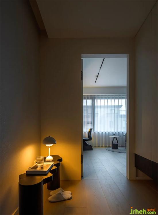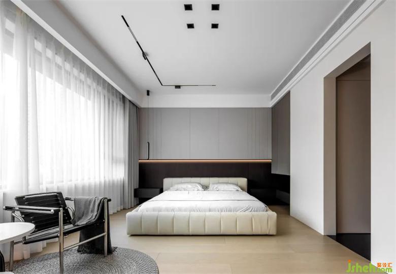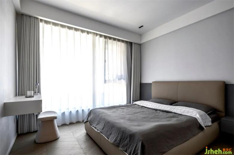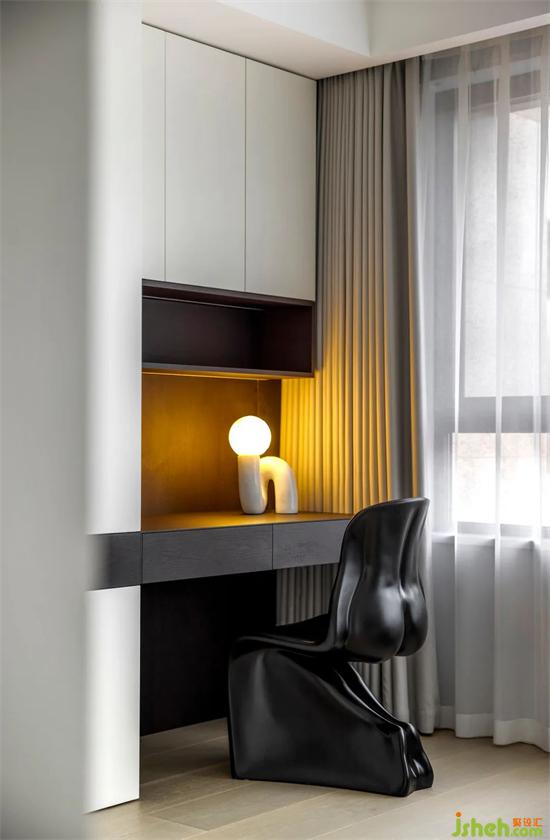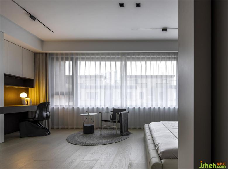 飄逸的輕紗白簾之內(nèi),以純色家具搭配木紋地板,形成了明度上的對(duì)比,豐富了空間層次。深棕色的背景墻上躍豪宅設(shè)計(jì)搭配淺色的床品,如鋼琴曲淺淺述說不與人道之的隱秘世界,營(yíng)造了一個(gè)溫馨舒適的休憩空間。