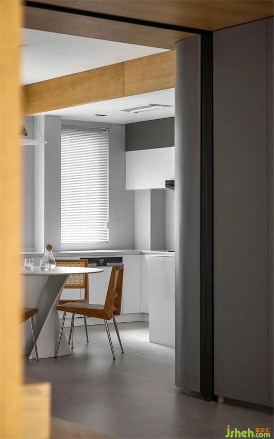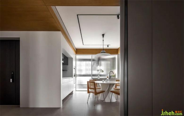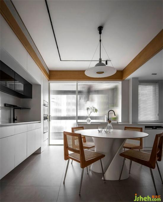 百葉窗、條紋磨砂的拖拉門引光入室,無(wú)需照明,不同光影裝修設(shè)計(jì)的形態(tài)便灑落一室。圓桌木椅,配上巖板餐桌,滿足一家三口的日常需求。