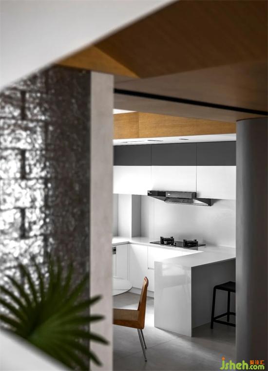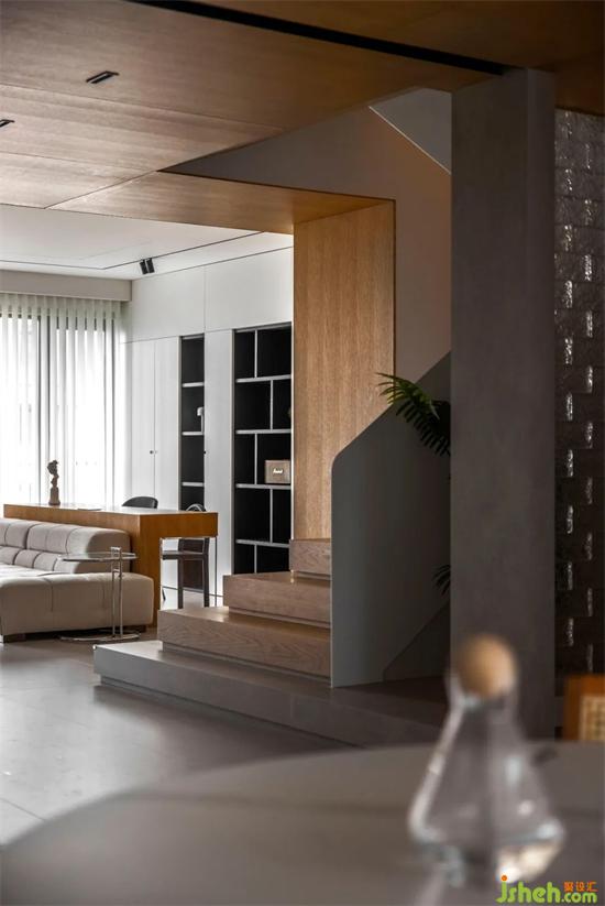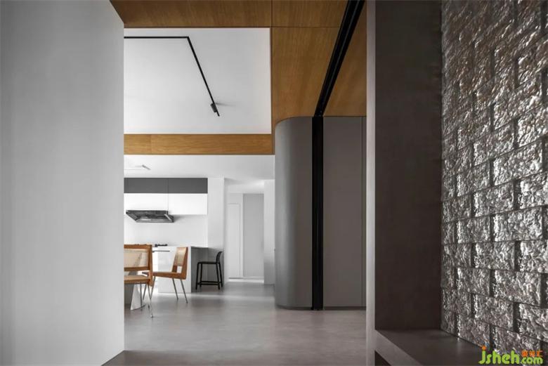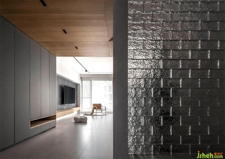 玄關(guān)的設(shè)計(jì)利落,在灰白色統(tǒng)一的裝修設(shè)計(jì)前提下,水晶玻璃磚和木飾面的碰撞,產(chǎn)生的波紋與光澤讓空間產(chǎn)生不一樣的情緒感受。黑色線條巧妙分割,使得生活空間在無(wú)形中劃分,增強(qiáng)空間層次感。