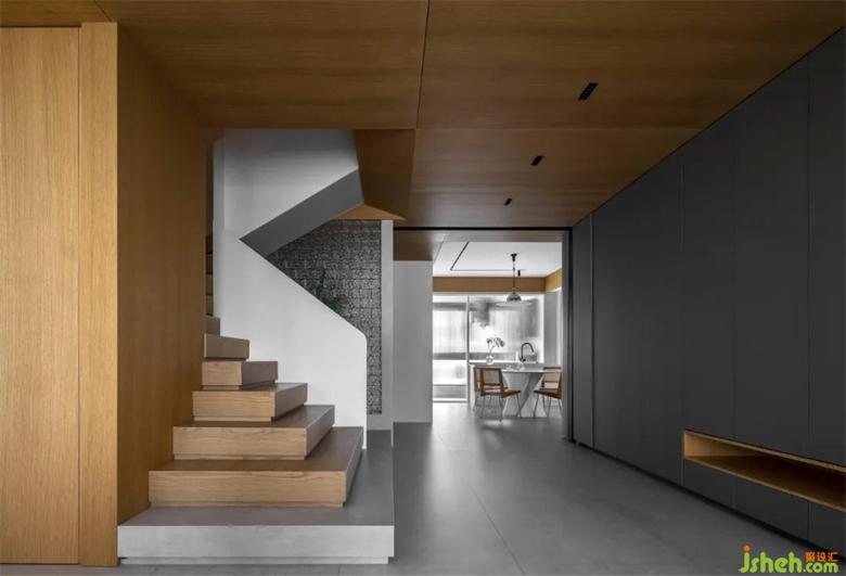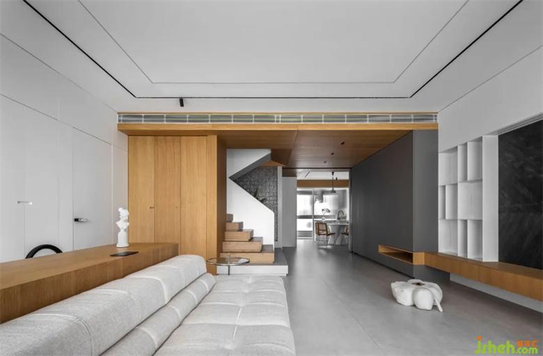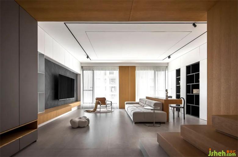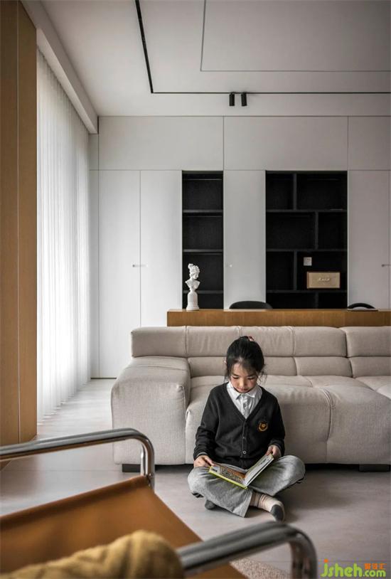 整個(gè)客廳空間采用了無(wú)主燈設(shè)計(jì),兩條貫穿客餐廳裝修設(shè)計(jì)的軌道燈就是主要的照明方式??蛷d處輔以筒燈點(diǎn)綴,增加局部區(qū)域的照明度。吧臺(tái)的設(shè)置,在空裝修設(shè)計(jì)間兼具多種功能??蛷d兩側(cè)的隱形壁櫥設(shè)計(jì),也使得儲(chǔ)存功能大大增加,在兼具美觀的同時(shí)包容生活的雜糅。
