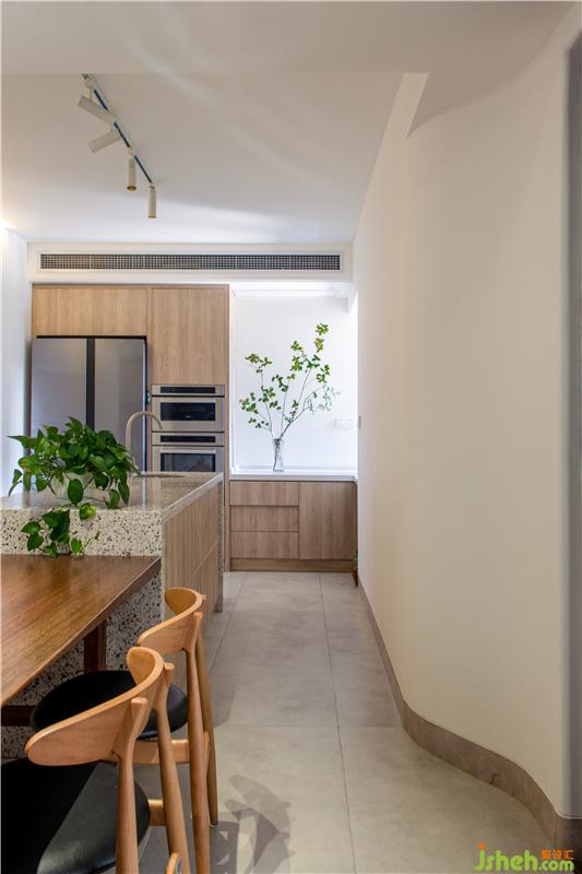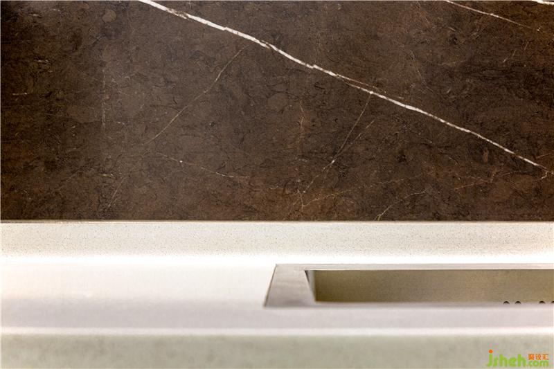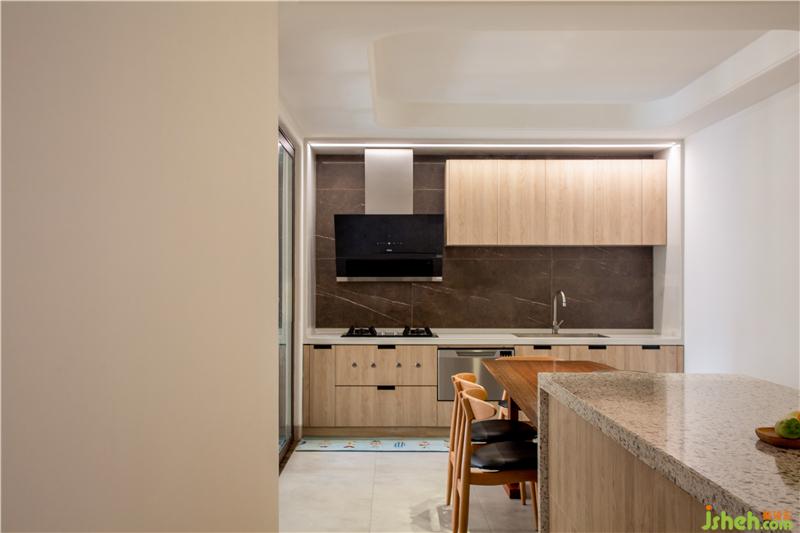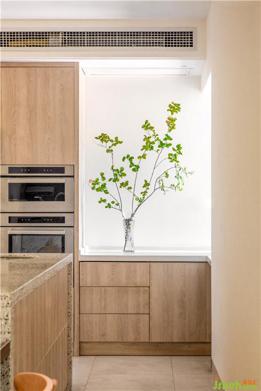 我們希望餐廚空間簡潔利落,讓家庭廚師日常操作順暢無阻點(diǎn),即使是臺面石材與磚之間也平和流暢,干凈整潔的廚房是主人善意純粹的人格物化。